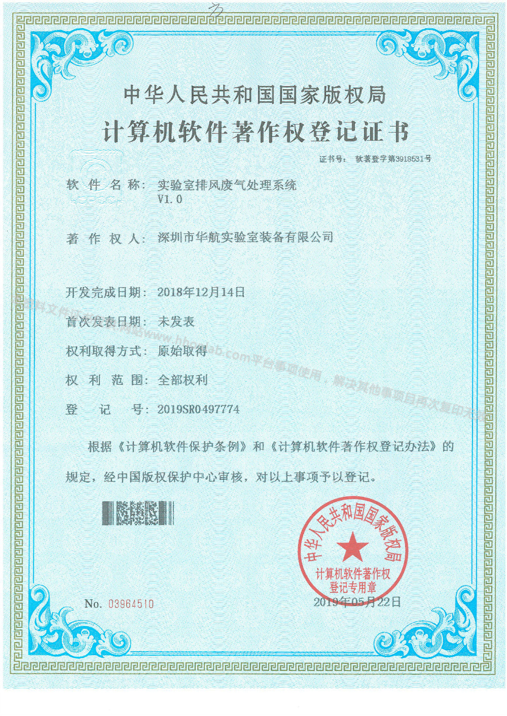 意昂体育1:实验室通风监测管理系统V1.0 计算机软件著作权登记证