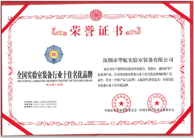 全国实验室装备行业十佳名优品牌 荣誉证书